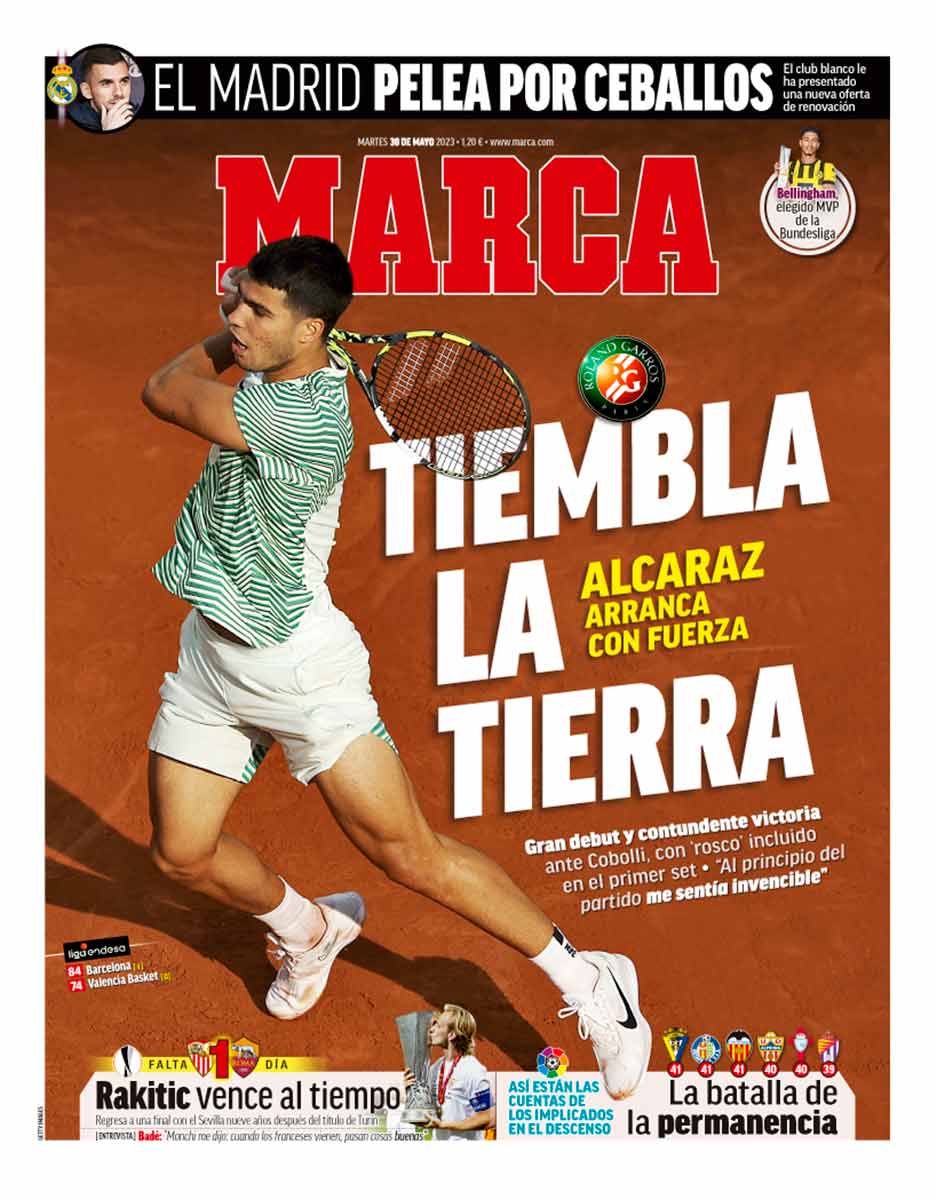En el diario de Godó, grande de España, también podemos leer en chiquitito que Mbappé afirma que seguirá en París, que es donde se encuentra Alcaraz, que ha comenzado Roland Garros con tal ímpetu que tiembla la tierra, lo que le hace merecedor de la portada de Marca.