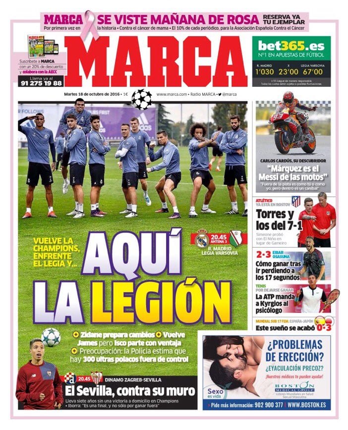 Hombre, lo de la legión me imagino que viene traído (muy por los pelos, sí) por el nombre del adversario de hoy. Forzado y casi tan ridículo como el posado colectivo, pero seguro que no es la peor portada de la historia de Marca.