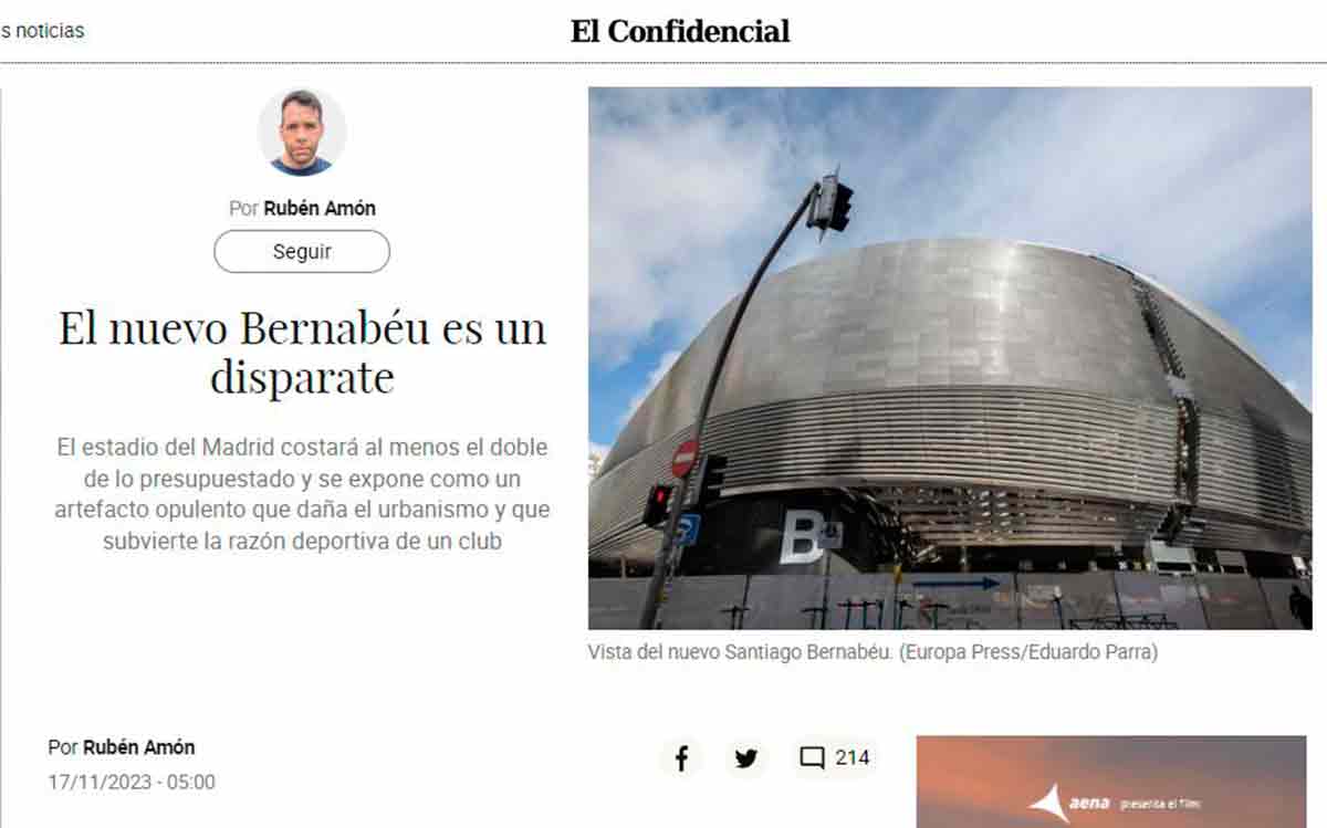 Dejando al margen la exaltación del dolor en la que parece recrearse el diario As, los asuntos propiamente deportivos del día resultan tan sosos como un sándwich de jamón york envasado, una ración de brócoli congelado, un Moldavia-Albania o un Kazajistán-San Marino (que los hubo ayer). Así que hoy nuestras miradas se tornarán a ese medio que “tanto quiere” a nuestro presidente, D. Florentino Pérez, El Confidencial. Un medio que debe de recibir información de un modo tan “confidencial” que a veces no le da tiempo a contrastarla y comete errores de bulto. Tan de bulto como si de la prensa deportiva se tratara. Tan de bulto como varias de las afirmaciones vertidas por el respetado y respetable periodista Rubén Amón ayer en su artículo El nuevo Bernabéu es un disparate.