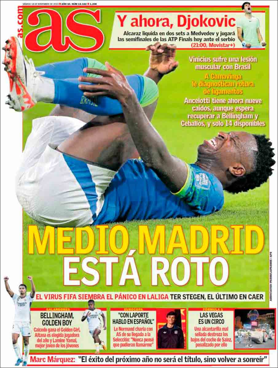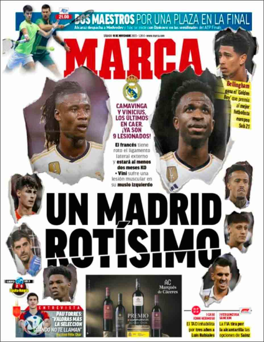 Hoy nos apetece poco asomarnos a la prensa deportiva del día. Muy poco en realidad. Lo habitual es que no nos apetezca nada revisar las insulsas y/o fantasiosas portadas de la prensa cataculé, pero en días como hoy nos apetece menos aún, si es que tal cosa es posible, acercarnos a las de la prensa madrileña, que se ceban con morbo rayano en el sadismo en las múltiples lesiones que deja el infame (y enésimo) parón de selecciones a la plantilla del Real Madrid.