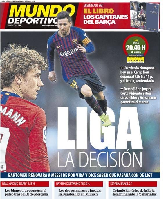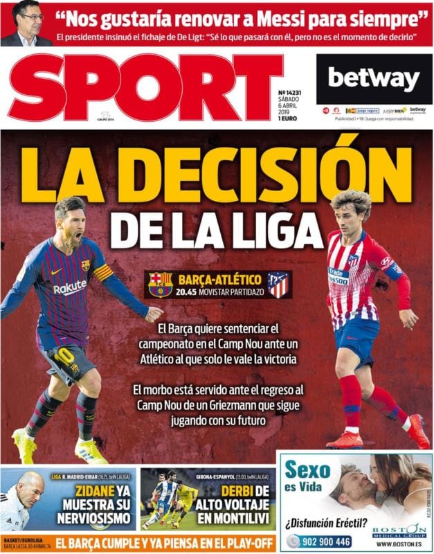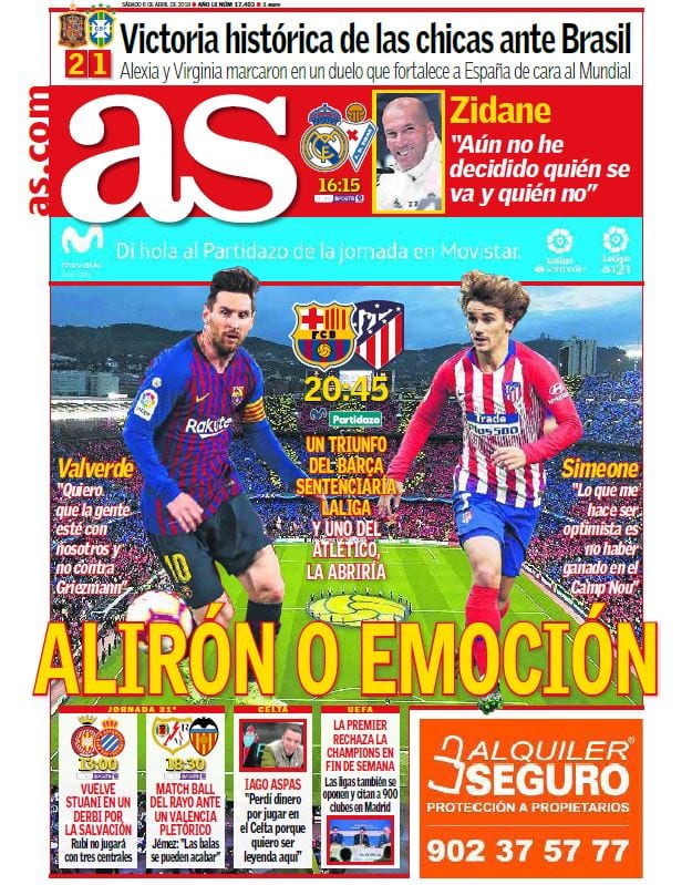 El resto de portadas nos llevan a un Barcelona-Atlético de Madrid que nos hubiera gustado ver bajo otro contexto. Sin embargo, el hecho de que el Real Madrid no esté en la lucha por el título nos ha dejado algo fríos incluso para un encuentro de semejante envergadura. Lo malo es que a la prensa también le sucede algo parecido. Se han quedado fríos y sin originalidad. Messi y Griezmann compartiendo hasta tres portadas y la palabra "decisión" presidiendo la prensa cataculé en homenaje -entiéndase la ironía- al bueno de Antoine, que hace meses comía en la mesa de Messi y Cristiano y puede acabar la temporada comiendo él solo en la mesa de la cocina mirando a los azulejos que tiene al lado del frigorífico. No estamos para demasiadas risas, pero hay que reír en la vida. Abracen la fe, abracen el verbo de Zidane, abracen el fútbol de Hazard y abracen el sentido del humor. Buen fin de semana, galernautas.