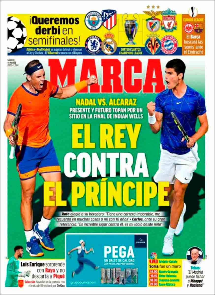 Afortunadamente, todo este buenismo bondadoso que estilan las portadas madrileñas es eclipsado por el enorme duelo entre madridistas que disputaran Carlos Alcaraz ante Rafa Nadal por un puesto en la final de Indian Wells. Madridismo a pelotazos.