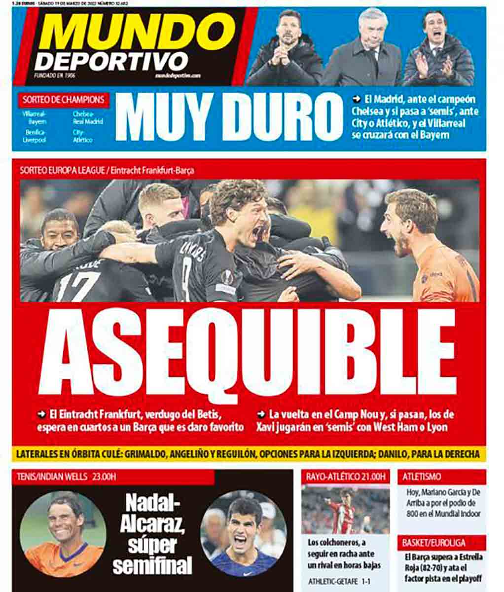 Al Barcelona le toca en gracia el Eintracht de Frankfurt —del que esperamos que haya mejorado algo tras el 7-3 que le endosaron don Alfredo y Puskas en Glasgow en la final de la Quinta Copa de Europa en 1960— y resulta que en un faldoncillo alevoso Sport anuncia que el Madrid se enfrentará a un Chelsea “debilitado”, tesis a la que pronto se sumaran más calvos AIC y detentores de parabólicas.