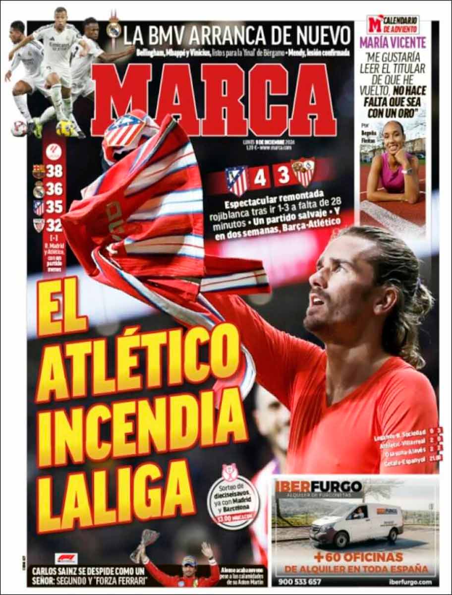 Marca, medio de cabecera del presidente de la patronal de clubes y juguetito predilecto de su mandamás, plantea el partido de ayer en el Metropolitano como una hazaña sin parangón, y trae a portada el gran momento de Griezmann.