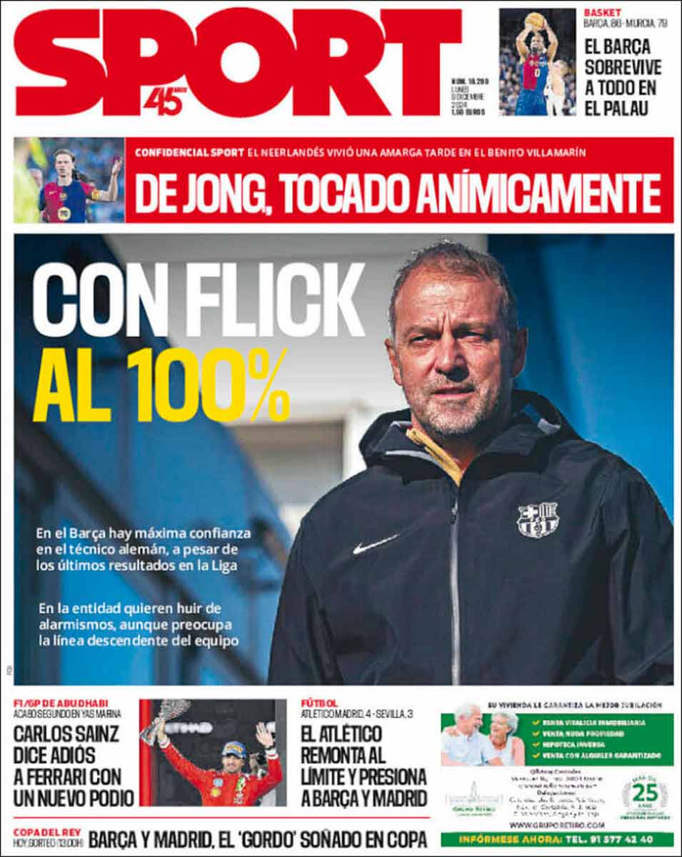 La portada de Sport es inquietante para el Padre Flick. Dice que la directiva culé está “al 100%” con él. La tradición futbolera de este país (y de ese también) marca —con perdón— que la confirmación de un entrenador en su puesto no es otra cosa que la antesala de su cese. Uyuyuy. Si además la cosa se llena de adversativas del tipo “(…) a pesar de los últimos resultados en la liga” o “(…) aunque preocupa la línea descendente del equipo”, la cosa es como para ponerse a temblar.
