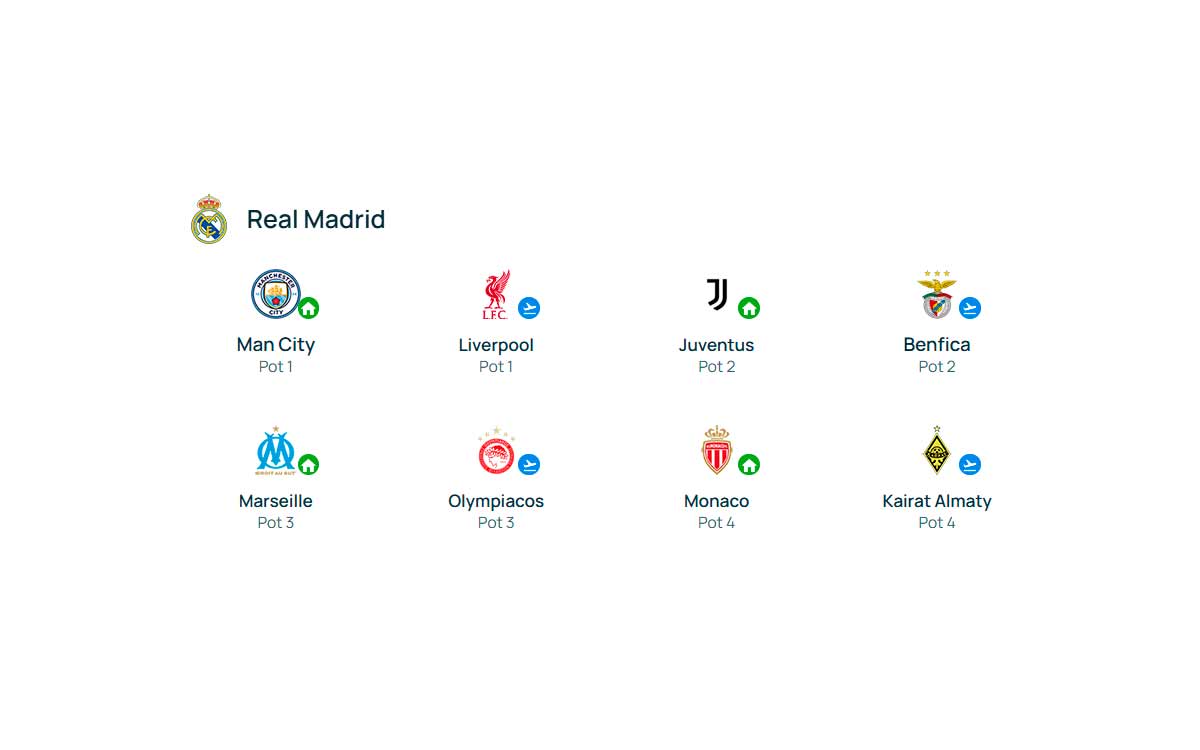 El Real Madrid tendrá un conjunto de rivales de nivel medio alto. El sorteo ha sido durísimo. Del bombo uno se medirá a Liverpool y Manchester City, del dos a Juventus y Benfica, del tres a OM y Olympiacos, y del cuatro a Mónaco y el Kairat kazajo. Los blancos no se podrán despistar ni relajar ni un segundo para conseguir las victorias. Ninguna perita en dulce, porque el Kairat por nivel lo es, pero teniendo que realizar un viaje de más de 10 horas en avión cambia el panorama de manera sustancial.