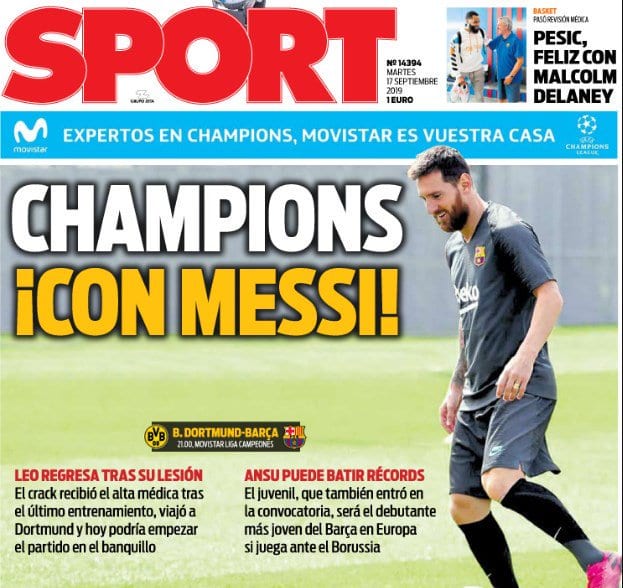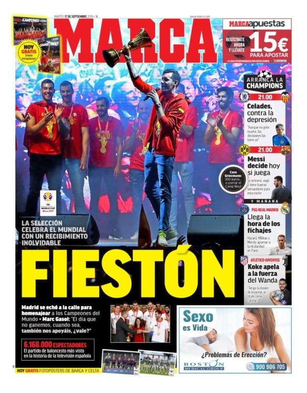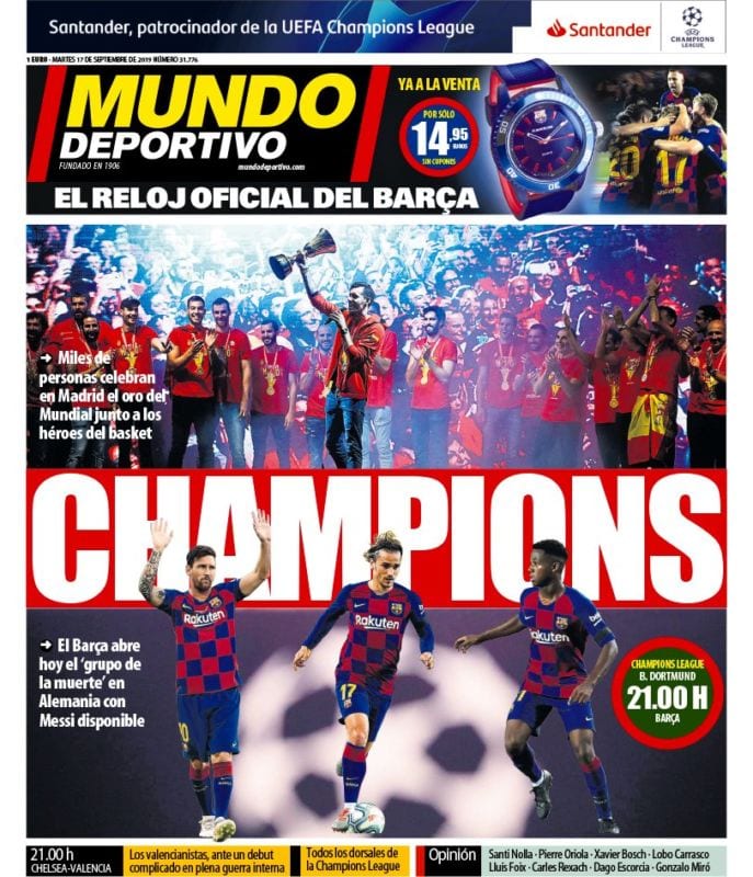 Mundo Deportivo, por su parte, logra armonizar el retorno de la Champions con la fiesta dedicada a la selección española de baloncesto en Madrid, utilizando como enlace, sabiamente, la propia palabra Champions. Llevamos dos días seguidos elogiando la portada de Mundo Deportivo. Algo nos ponen estos enfermeros del manicomio en el desayuno.