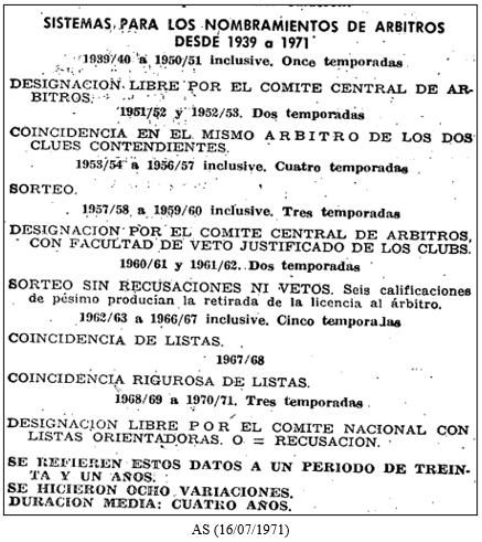 Como guía orientativa previa a este estudio, nos sirve este resumen de los distintos sistemas de designación que habían sido utilizados desde el final de la Guerra Civil, que expuso, en la Asamblea de la Real Federación Española de Fútbol del 15 de julio de 1971, Antonio Calderón, gerente del Real Madrid: