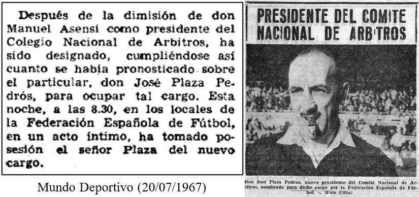 El 19 de julio de 1967, a las ocho y media de la noche, en los locales de la Federación Española de Fútbol, José Plaza Pedraz tomó posesión del cargo de presidente del Colegio Nacional de Árbitros, en sustitución de Manuel Asensi.