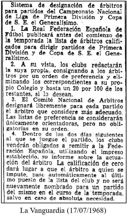 - La Real Federación Española de Fútbol publicará antes del comienzo de la temporada la lista de árbitros calificados para dirigir partidos de Primera División y de Copa de S. E. el Generalísimo.