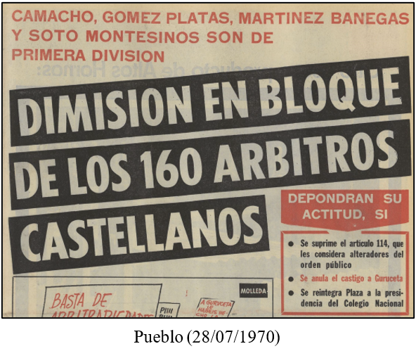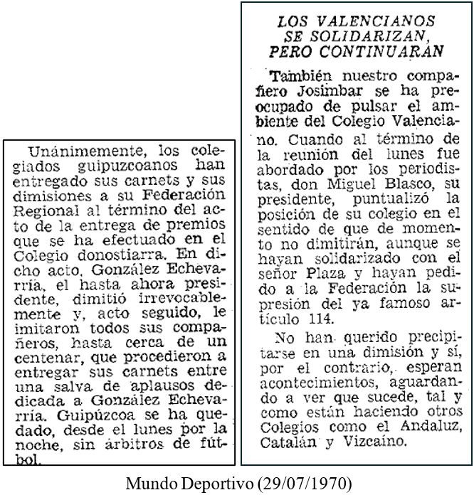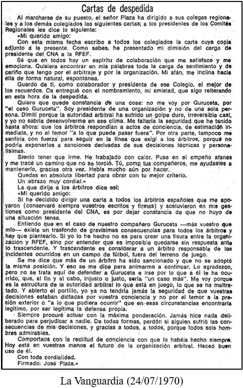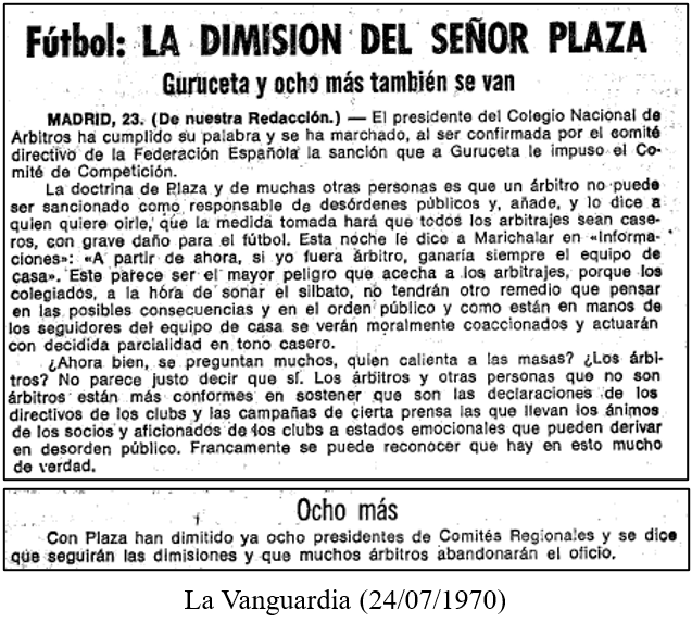 El 22 de julio de 1970, José Plaza dimitió como presidente del Colegio Nacional de Árbitros. Aunque no sea explicar este asunto el objetivo del presente artículo, al contrario de lo que siempre se ha afirmado, Plaza no dimite por el hecho de que se sancione al colegiado Guruceta, tras un error grotesco al pitar un penalti a favor del Real Madrid en un partido de Copa frente al F.C. Barcelona. A Guruceta se le sanciona seis meses, como responsable de los desórdenes públicos ocurridos en dicho partido. Este hecho, que un árbitro sea considerado responsable de lo que ocurra fuera del terreno de juego, solivianta al colectivo arbitral y termina motivando la dimisión de su presidente. Junto a él, dimitieron numerosos presidentes regionales y la totalidad de los árbitros castellanos y guipuzcoanos.