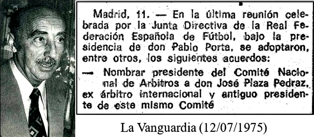 El 11 de julio de 1975, en la reunión de la Junta Directiva de la RFEF, José Plaza vuelve a ser nombrado presidente del Comité Nacional de Árbitros, con Pablo Porta como presidente de la RFEF.