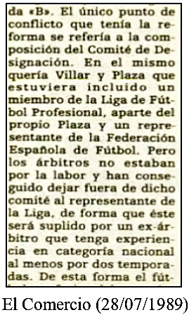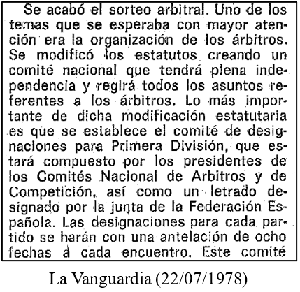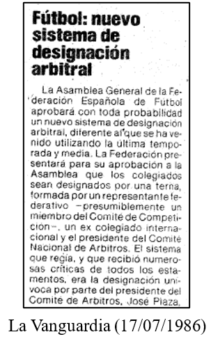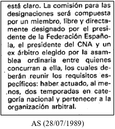 - Aprobado el 27 de julio de 1989, en la Asamblea de la Real Federación Española de Fútbol. Se rechazó la propuesta de incluir a un miembro de la Liga de Fútbol Profesional en el Comité de Designación.