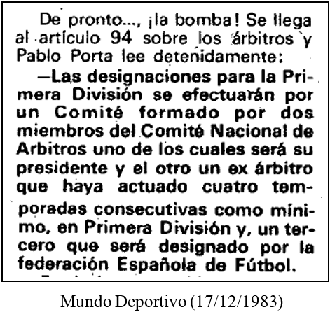 - El 16 de diciembre de 1983, en la Asamblea Extraordinaria de la Real Federación Española de Fútbol, se aprueba el cambio de sistema de designación arbitral. En esta ocasión, por un comité formado por el presidente del Comité Nacional de Árbitros, un exárbitro que haya actuado cuatro temporadas consecutivas, como mínimo, en Primera, y un tercer miembro que será designado por la Federación.