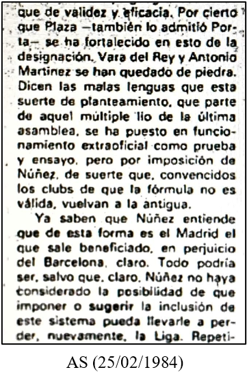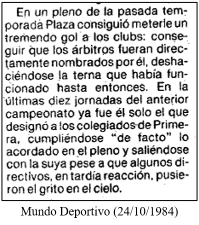 - El 24 de febrero de 1984, tras la reunión de la Junta de Gobierno de la RFEF, se anunció que la designación había quedado exclusivamente en manos de Plaza, con el beneplácito de los clubes, por lo que Plaza designó en solitario las 10 últimas jornadas de esa temporada. Curiosamente, parece ser que la propuesta fue de Josep Lluis Núñez, presidente del F.C Barcelona y vicepresidente de la RFEF.