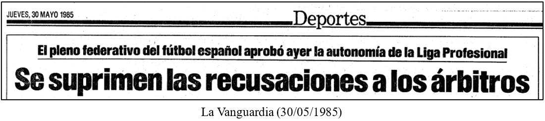 - El 29 de mayo de 1985, en la Asamblea de la Real Federación Española de Fútbol, se aprueba la supresión de las recusaciones a los árbitros, por lo que ya no se permite en la temporada 1985/86.