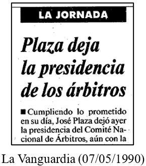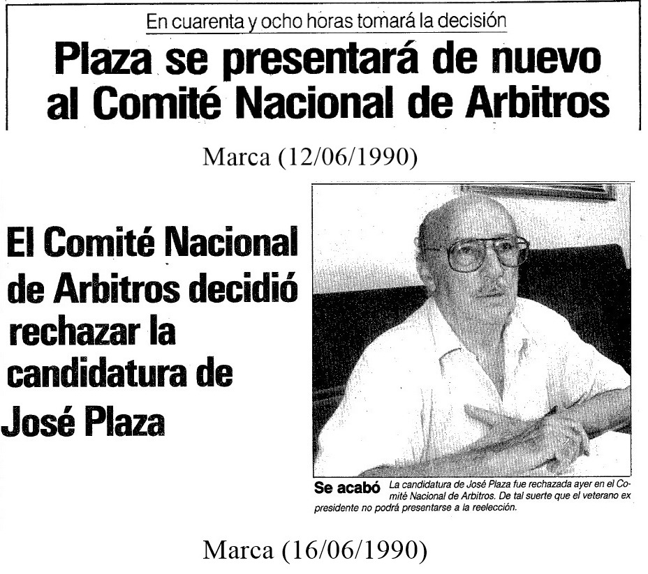 El 6 de mayo de 1990, José Plaza Pedraz deja la presidencia del Comité Nacional de Árbitros al pactarlo así con el presidente de la Real Federación Española de Fútbol Ángel María Villar. Un mes después, y tras recibir telegramas de apoyo del colectivo arbitral, quiso presentarse a la reelección, pero la Junta electoral no se lo permitió y Pedro Sánchez Sanz fue elegido su sucesor el 9 de julio de 1990.