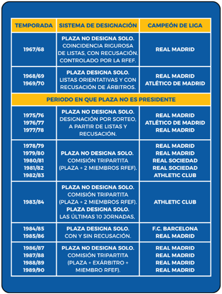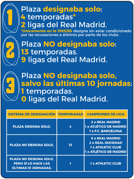 Se ha construido un falso relato entre los títulos del Real Madrid y el poder del presidente arbitral designando en solitario (13 temporadas y 11 títulos) y cuando lo hizo en una comisión tripartita (5 ligas y 0 títulos). De igual manera que la realidad documentada demostró que el bulo de los presidentes del CTA no solo era falso, sino que, precisamente, al contrario, hace más de 70 años que ningún presidente del CTA tiene pasado madridista, a continuación, explicamos y documentamos que este relato en torno a las designaciones de Plaza también es falso, incorrecto e incierto.