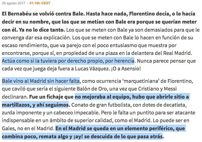 "Se puede ser madridista y decir que Bale jugó mal el domingo, en efecto.