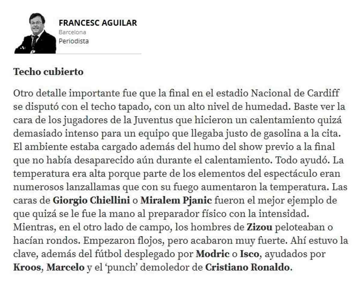 En la final de 2018 estuvieron hablando de la “carnicería” de Ramos por su agarrón a Salah, una carnicería consistente en devolver un agarrón con tan mala suerte que en el forcejeo sobre el brazo derecho el egipcio se lesionó el izquierdo. También rajaron durante horas y muchas páginas escritas sobre las conmociones cerebrales de Karius, un portero con cantadas a lo largo de toda su carrera, pero que ese día estaba mareado, groggy, conmocionado o borracho, vaya usted a saber. Que se me perdona la expresión, pero la colección de soplapolleces que nos toca leer en ocasiones es enorme. Mi favorita sigue siendo la justificación de Francesc Aguilar (Mundo Deportivo) para explicar cómo la Juventus de Turín, que solo había recibido tres goles en ocho meses de competición, había visto perforada su puerta hasta en cuatro ocasiones en la final de Cardiff. Un párrafo genial, hilarante: los Black Eyed Peas, actuando bajo el techo cubierto del National Welsh Stadium antes del inicio del partido, habían sido los culpables de la victoria blanca :