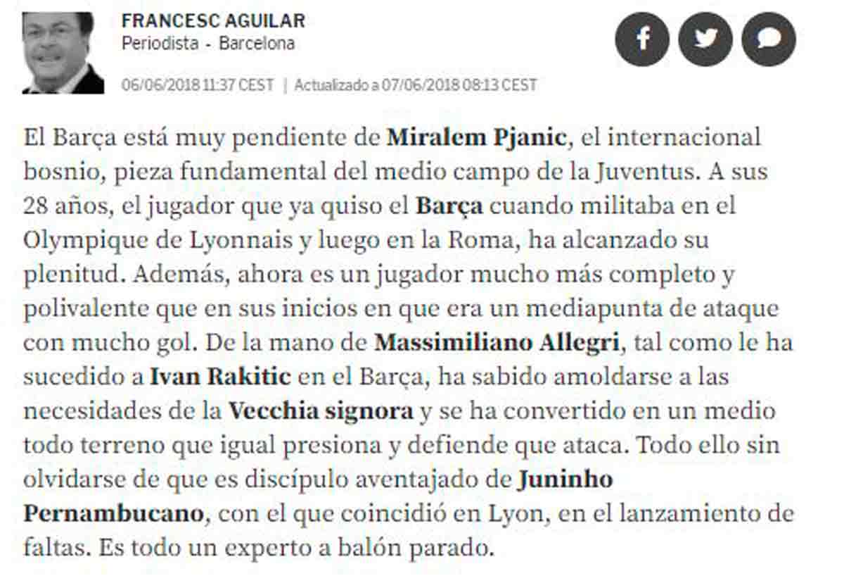 Chiellini (32 años entonces) y Bonucci (30) pasaron a ser de golpe unos viejos lentos e inseguros, si bien apenas cuatro años después, cuando ganaron la Eurocopa con Italia con 34 y 36 años, se convirtieron por arte de magia en unos “veteranos experimentados”. Pjanic debía ser otro de esos veteranos a los que afectó “la intensidad” de la preparación y el humo de la pirotecnia. Un veterano de 27 años que solo un año después era para el mismo periodista un jugador “completo, polivalente” y “en plenitud”: