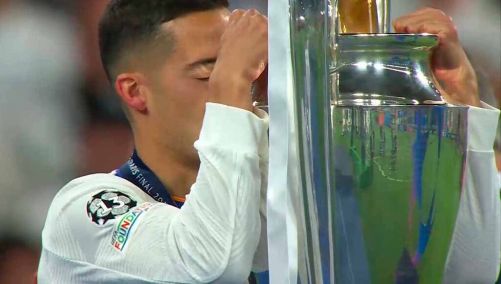 Esa luz que se nos aparece deformada por la superficie cóncava de esa copa que está hecha del material con el que están hechos los sueños, es como la luz que dejaban nuestros padres encendida al final del pasillo todas las noches para que no tuviéramos miedo. Es una caricia del pasado, un beso de esa memoria inasible de nuestra propia infancia que a veces nos sacude en el momento más insospechado, como si nos tirara desde el más allá o desde lo más profundo de nuestra conciencia. Es una luz que conforta y que perdona, una luz indulgente y benévola, una nana de la cebolla, el olor de la casa de los abuelos. La Copa de Europa que agarra Lucas Vázquez, contra la que se estrecha y a la que besa Lucas Vázquez como abrazamos y besamos nosotros a uno de los nuestros que haya estado ausente mucho tiempo, nos devuelve la sonrisa consoladora de quienes nos quieren. De quienes siempre nos van a perdonar no ser las personas que dijimos que íbamos a ser, las que creímos que debíamos ser y prometimos que seríamos. La copa, tan limpia y tan bruñida, en la que se quedan pegadas todas las huellas profanadoras de los ávidos conquistadores que acaban de ganarla, nos enseña el mundo que siempre quisimos construir. El mundo bello y mejor que llevábamos dentro de nuestros corazones nos saluda desde el otro lado, reflejado en el metal, y recordamos cuánto lo quisimos y todo lo que estábamos dispuestos a dar para conseguirlo.