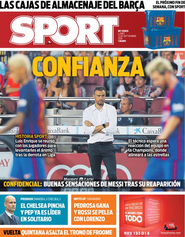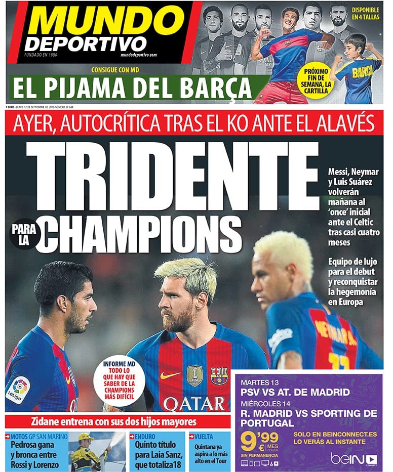 Buenos días. No es tanto por una cuestión de superstición como de estética el que nos escandalice que nadie se aperciba -especialmente allá donde deberían apercibirse- de cuál es el problema del Fútbol Club Barcelona, la lacra que les asola en este aciago comienzo de temporada, con derrota en el Nou Camp incluida ante el recién ascendido Alavés donde milita el prometedor centrocampista madridista Marcos Llorente. ¿Cómo es posible que nadie se haya dado cuenta aún? ¿Ni siquiera con un simple vistazo a la primera plana de Mundo Deportivo quedan claras, diáfanas las razones del descalabro?