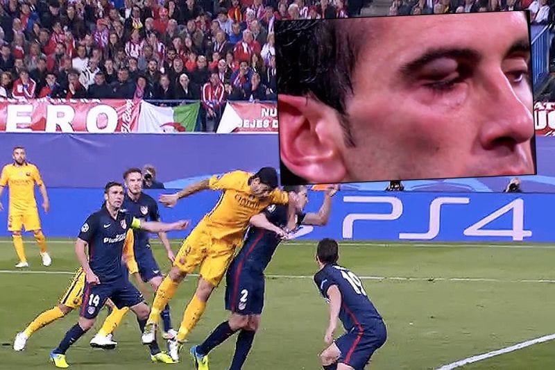 En el partido de vuelta de estos mismos cuartos de final, en el Calderón, el colegiado Rizzoli sí vio agresión de Suárez a su compatriota Godín, pero solo sancionó con amarilla. Fíjense cómo le dejó el ojo al defensor atlético: