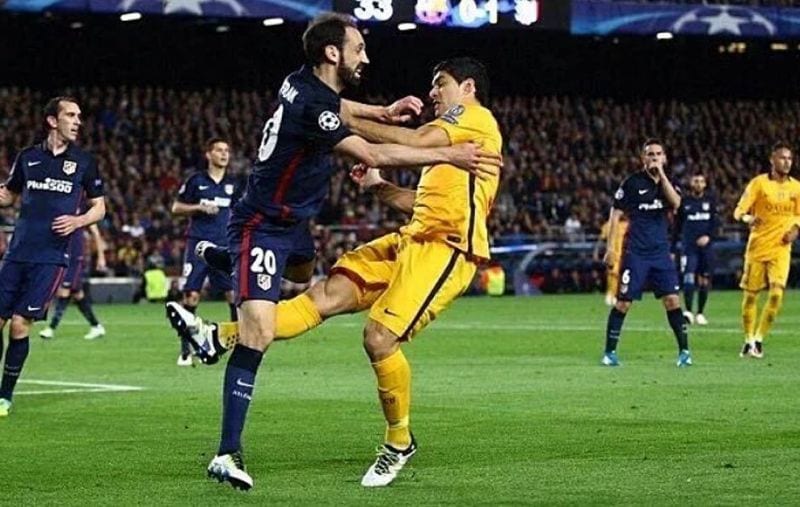 Y por fin, esta es la única agresión que le costó la expulsión a Suárez. Pero presten atención, que no es roja directa, sino expulsión por doble amarilla. Se trata de una entrada a Koke, jugador atlético, en el partido de vuelta de semifinales de Copa del Rey, el pasado 7 de febrero de 2017, en el Nou Camp, en el minuto 88. El héroe, el señor Jesús Gil Manzano: