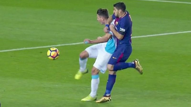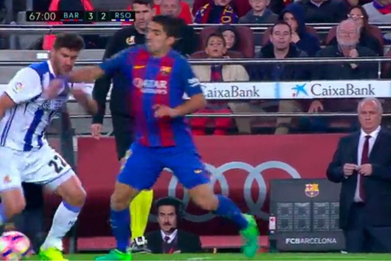 Se observa cómo Suárez propina un codazo en la nuca al defensor. Los comentaristas televisivos, en este caso de Movistar Partidazo (Carlos Martínez, Michael Robinson y Julio Maldonado, Maldini) ven claramente en la acción las malas intenciones de Suárez. Sin embargo, Robinson únicamente acierta a decir "eso no se hace". Ninguno de ellos decreta, como sí hacen en otros muchos casos, que esa agresión supone una tarjeta roja flagrante, que podría cambiar el curso del partido por ser en el minuto 19. Tampoco hacen referencia al siguiente partido de Liga, el Clásico, del que Luis Suárez no debería formar parte por la correspondiente sanción, o por la simple existencia de Justicia Deportiva. Y ni mucho menos se hacen referencias despectivas al jugador como sí se hizo con Isco, al que en la única ocasión en que dio una mala patada se le llamó "niñato" por parte de Carlos Martínez. Con Isco, los comentaristas no tuvieron ningún problema en juzgar, decretar el castigo, y hasta adelantarnos a los televidentes las razones por qué lo hizo: la personalidad problemática del jugador, ese "niñato".