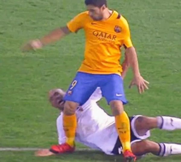 A Balenziaga, jugador del Athletic Club, en la ida de la final de la Supercopa de España, el 14 de agosto de 2015, en la disputa de un balón, cuando el jugador del Athletic estaba situado a la espalda de Suárez, le suelta un codazo. El video no deja dudas.