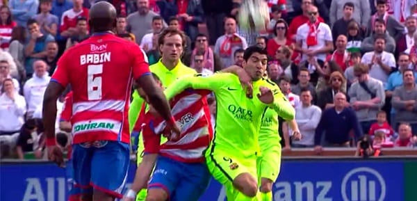 Codazo a Cala, jugador del Granada, en la jornada 25 de la Liga 2014/15, el 28 de febrero de 2015, en la disputa del balón en el minuto 15. Jaime Latre sanciona con amarilla. El video, a vuestra disposición en youtube, no deja lugar a dudas: roja directa. No se le mostró, claro.