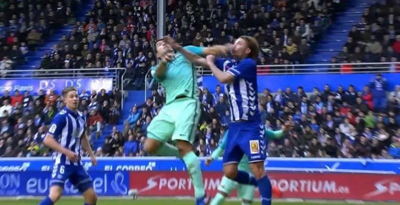 Codazo a Alexis Ruano, defensor del Alavés, en la jornada 22 de la Liga 2016/17, el 11 de febrero de 2017. Clos Gómez no sancionó ni con amarilla: