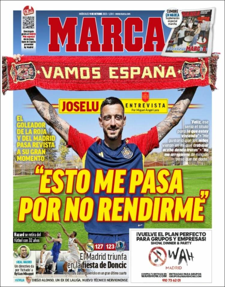 De esto se habla en Marca, que en un faldoncillo ridículo consigna los grandes guarismos (127-123) de un encuentro memorable que a los más viejos nos recordó al espíritu de aquellos torneos de Navidad vintage, pero no se habla ni de lejos lo suficiente. Hay parón de selecciones, ya sabéis, España juega una emocionante partido contra no sabemos quién e ignoramos con qué objeto, pero la ocasión la pintan calva para que los plumillas departan con los seleccionados al calor de la concentración. Y es así que tanto Marca como As y sus homólogos (?) catalanes dejan en segundo plano a Doncic para consagrarse en cuerpo y alma a estas entrevistas con los hombres de Luis de la Fuente, que hasta nueva orden o nuevo aplauso es el seleccionador nacional.