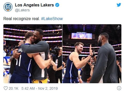 Real recognize real. Fue la expresión utilizada por la cuenta de Twitter de los Ángeles Lakers para referirse al épico duelo que acababan de mantener LeBron James y Luka Doncic.