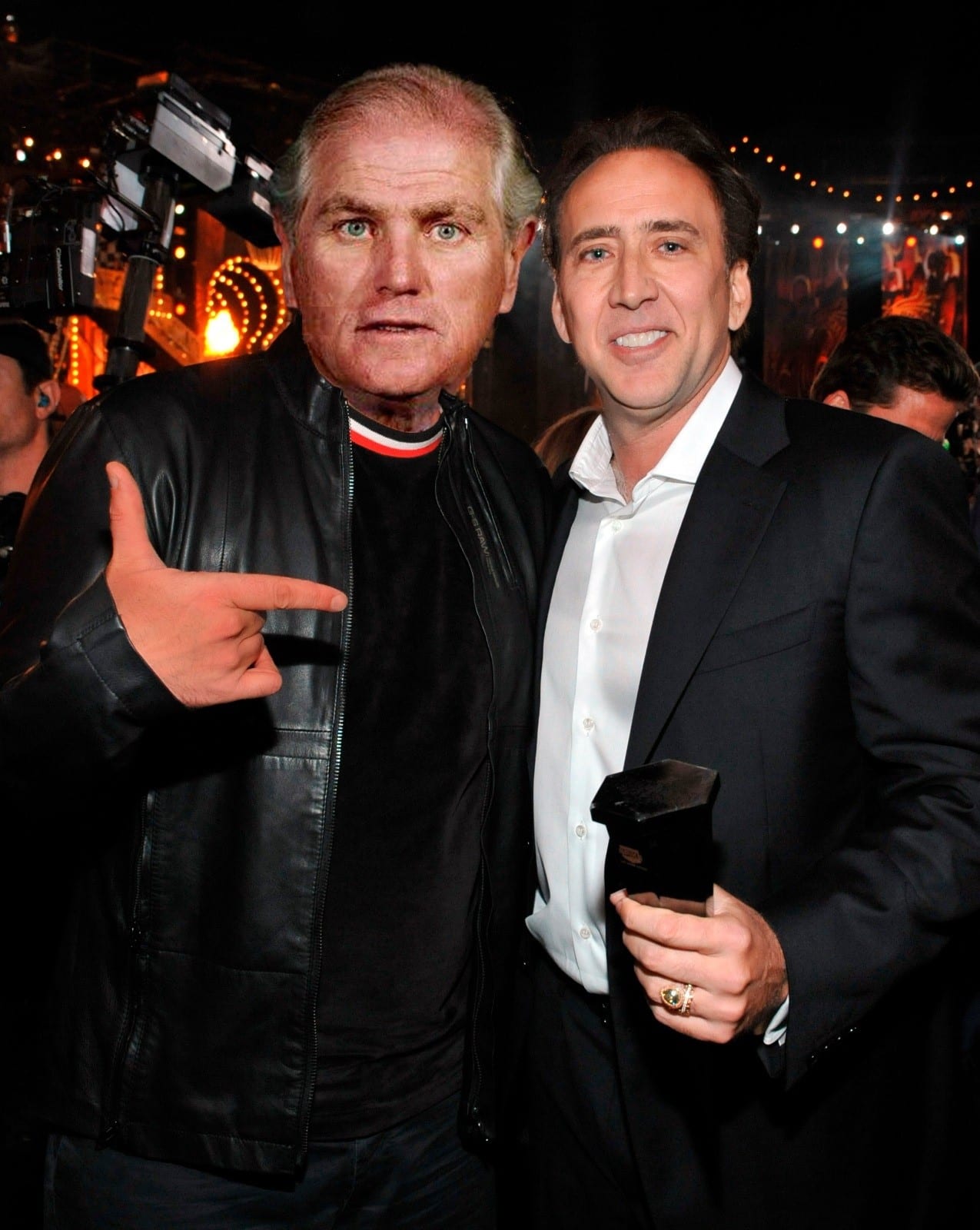 El Nicolas Cage verdadero está a punto de llegar al palco y producirse la hecatombe, pero Padrós aparece a toda velocidad en su moto con Coppola de paquete e interceptan al sobrino rebelde, que se asombra sobremanera al ver a su tío allí.