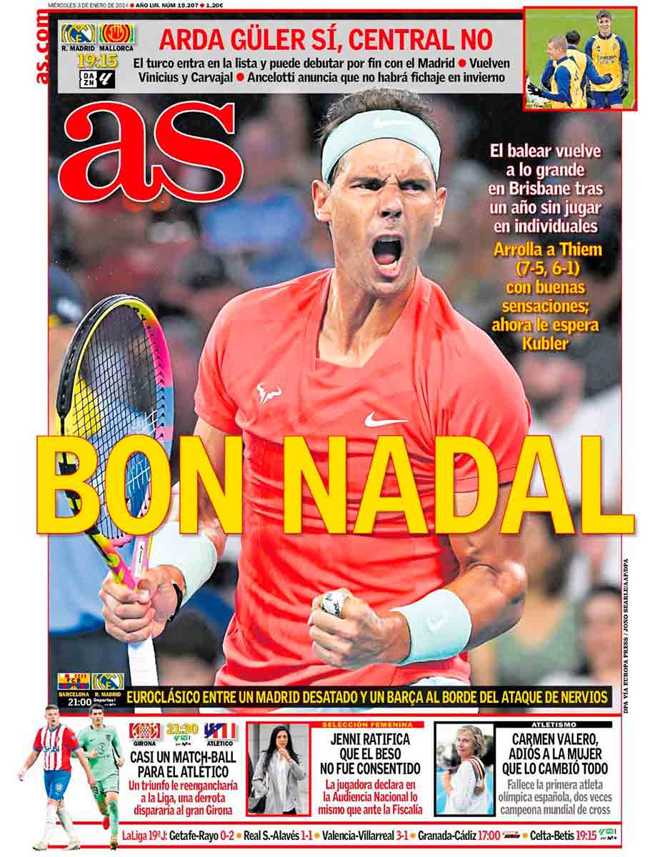 Además de Nadal, lo más relacionado con el Madrid que podemos leer sin necesidad de lupa es la parte derecha del diario de Gallardo, donde se destaca que el equipo blanco puede obtener el título simbólico de campeón de invierno si gana al Mallorca en esta última jornada de la primera vuelta. En La Galerna os contaremos lo que suceda, porque nuestra portada siempre es para el Real Madrid.