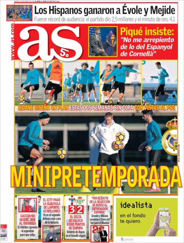 En 'La Ouija Today', mientras tanto, informan sobre una minipretemporada en el Real Madrid. Al parecer, Zidane quiere tener al equipo en buen tono físico de cara a la eliminatoria contra el PSG que empezará el próximo 14 de febrero. No es la portada del siglo, pero, al menos, Relaño no se mete en el fango ni ataca al campeón de Europa. Algo es algo.