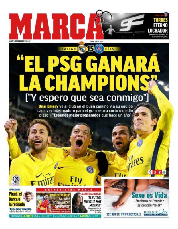Como decíamos al principio, ningún medio se ha hecho eco de las declaraciones de Javier Tebas. Tampoco la prensa madrileña. En 'Marca' le dan cabida a Unai Emery, que cree que el PSG ganará algún día la Champions League -esa parte de "algún día" la han omitido hábilmente-, aunque espera que sea con él al mando. Vaya, qué sorpresa, un entrenador deseando conquistar el título más importante.