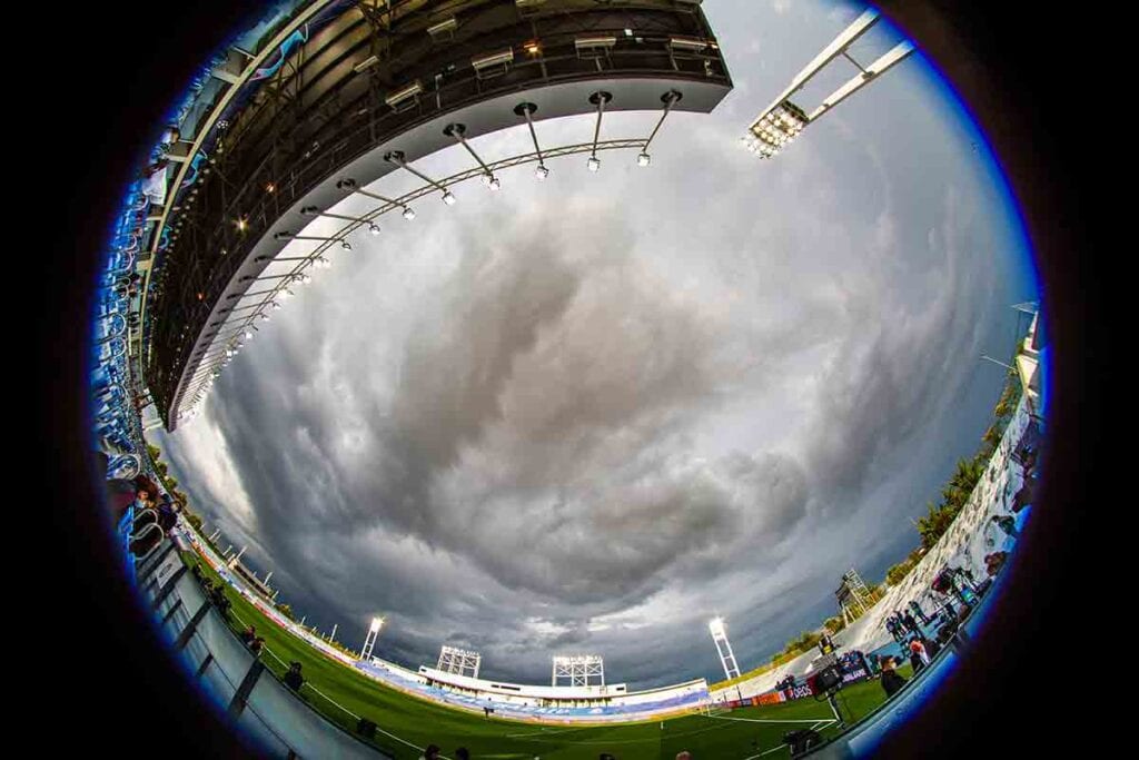 Si juegas en casa contra un equipo que va de azul y no puedes tener a tu público, la lona que cubre las gradas debe ser blanca, muy blanca, con las letras del Real Madrid en negro