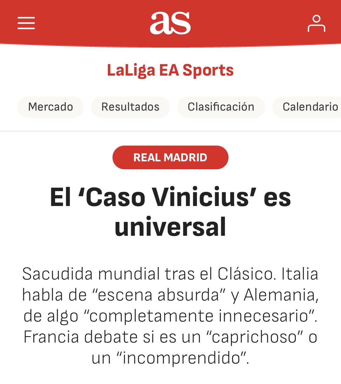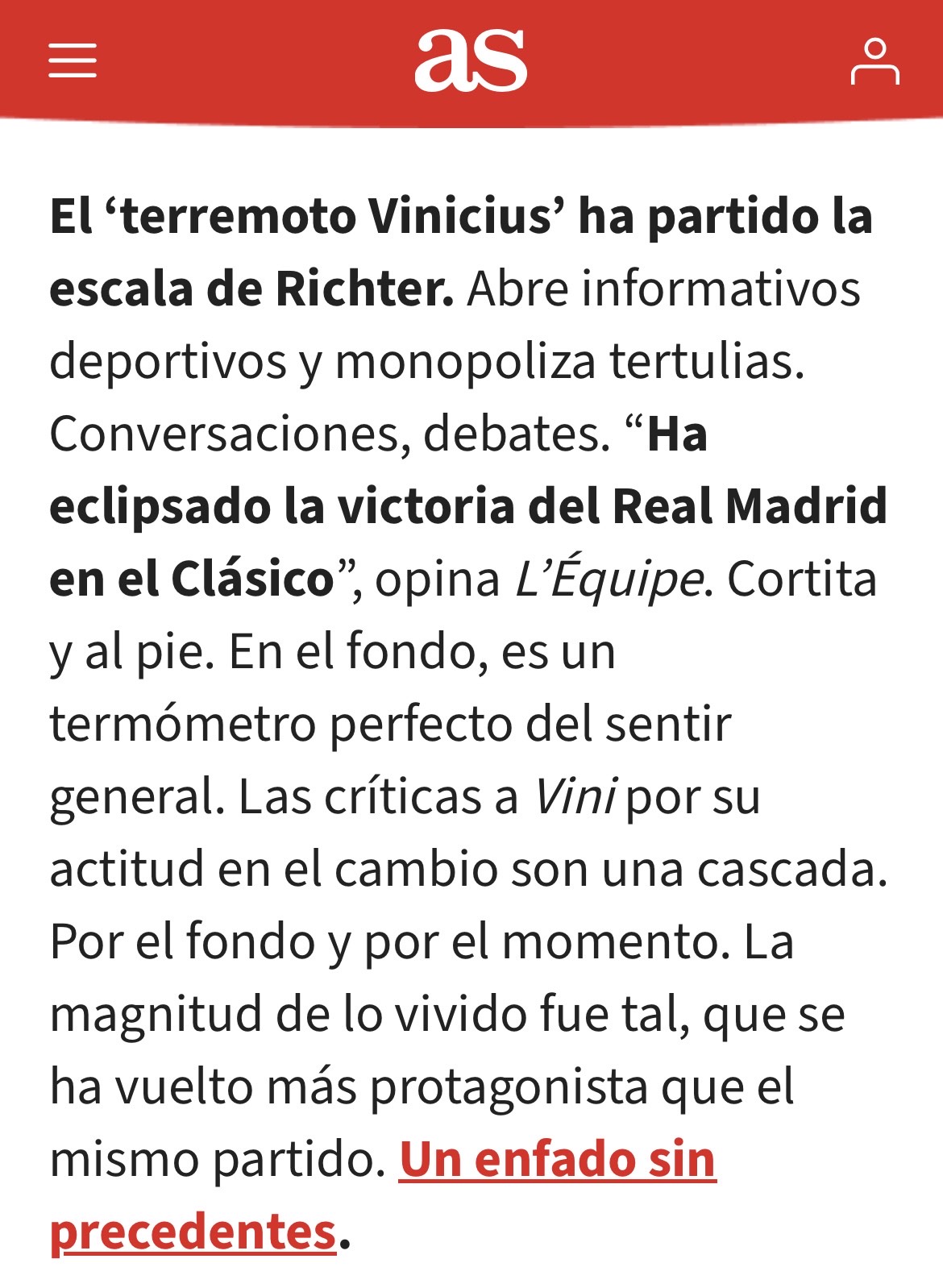 “Las críticas a Vini por su actitud en el cambio son una cascada”. No diremos que ahí precisamente, a la gran cascada, es donde debería acudir ipso facto este redactor de As, empeñado en abortar a todas luces cualquier atisbo de felicidad madridista. Sergio López, se llama el chico, quien además añade: “La magnitud de lo vivido fue tal que se ha vuelto más protagonista que el propio partido”. ¿No será, estimado Sergio, que eres precisamente tú (y detrás de ti tu periódico) quien quiere restar protagonismo a la victoria del Madrid para otorgárselo en cambio, de manera absolutamente artificial, a una anécdota cuya relevancia es objetivamente muy inferior a la de la victoria misma? Si coges líneas sueltas de periódicos de aquí y de allá, seguro que lo logras. Ánimo.