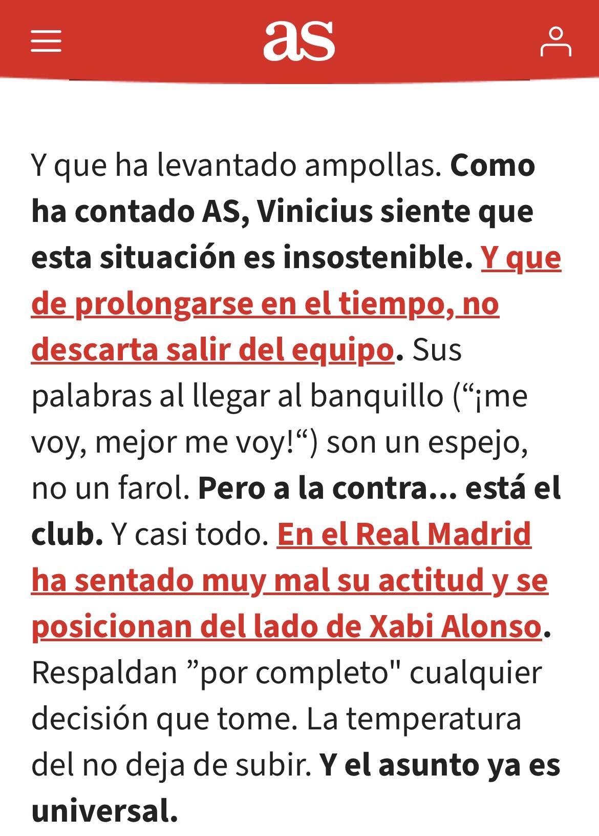 He leído hoy, pinchando una noticia qye republicaba alguien en X escrita por Marca o AS, no recuerdo, del gran problema existente hace mucho tiempo entre Vinicius y Xabi, y señalaban que hay malestar entre muchos jugadores madridistas con Xabi y su nivel de intromisión y detallismo, que antes se les daba más libertad para jugar.