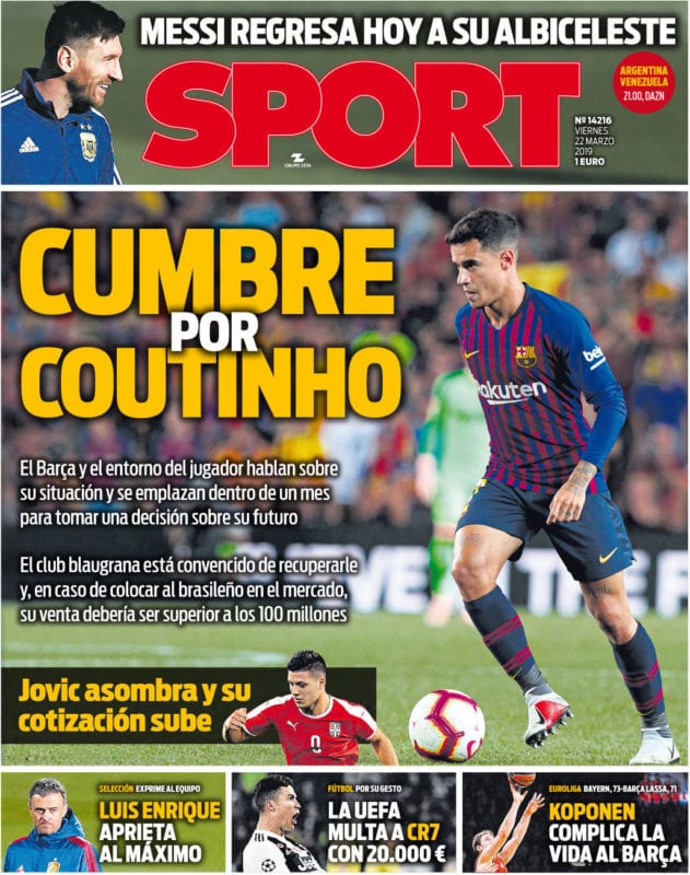El único que se atreve a abrir un espinoso asunto culé en su portada es el siempre vigilante diario Sport. Cumbre por Coutinho dicen. En plan conferencia de paz porque de la Aldea del Arce blaugrana solo emana la bondad y los buenos sentimientos.