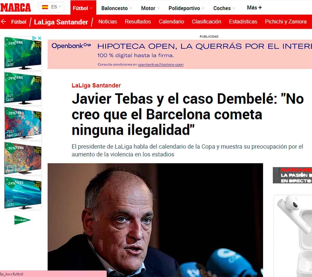 Podéis leer el artículo entero pinchando aquí, aunque el título es muy esclarecedor de los valores —o valors, como dicen ellos— azulgranas: “El maldito ‘fair play’ castiga al Barça”. Pero lo es más aún si escribimos fair play en castellano: “El maldito juego limpio castiga al Barça”. Es decir, se quejan de que no les dejan hacer trampas. Para ser más exactos, lamentan que tienen más difícil hacer trampas en el ámbito del límite salarial, porque hay muchos más escenarios y no en todos tienen tantos problemas para actuar como les place. Por ejemplo, no tienen tantos problemas para presuntamente extorsionar públicamente a un futbolista amenazándolo con enviarlo a la grada si no renueva con las condiciones que el club impone. Hablamos del caso Dembélé, sí. Y decimos que no tiene problemas porque el propio Tebas dice que en este caso la presunta coacción y el presunto acoso laboral no serían ninguna ilegalidad.
