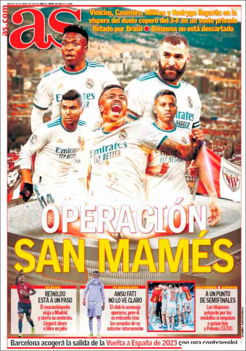 La portada de As tiene el colorido de las vallas publicitarias quemadas por el sol en una carretera secundaria de La Mancha. “Operación San Mamés”, titulan. Se refieren a la negociación del Madrid con la Federación Brasileña para poder contar con los futbolistas a los cuales paga puntualmente su sueldo en el próximo choque copero del 3 de febrero frente al Athletic. Más allá de la expropiación de activos propios, cabe preguntarse por qué Brasil selecciona a tantos jugadores del Real Madrid que, según muchos periodistas, son malísimos. Es probable que tratemos pronto sobre ello.