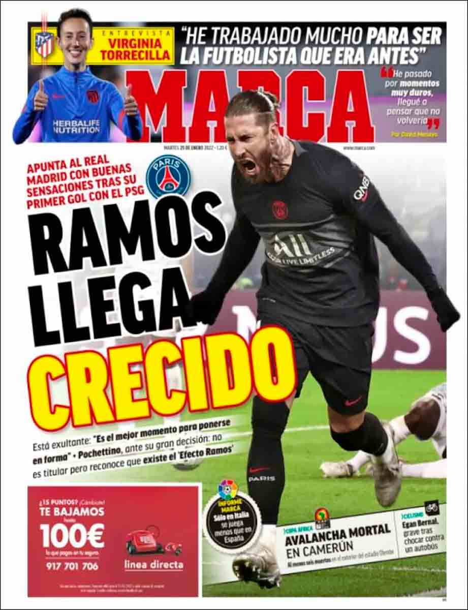 Marca no hace mención en su frontispicio a la cena de Xavi, sino que elige al exmadridista Ramos para ilustrarla y titula: “Ramos llega crecido”, como si se tratase de un río después de abundantes lluvias. El motivo del subidón del central es que marcó su primer gol con el PSG. Dicen que está exultante, “Es el mejor momento para ponerse en forma”, declara el futbolista. Lo oportuno del momento es porque no a mucho tardar se enfrentará al Madrid en Champions, eliminatoria en la cual deseamos que no juegue bien y no marque. Aunque para el resto de encuentros le deseamos lo mejor, sobre todo que se solventen sus problemas físicos, esos que le han llevado a jugar solo de Pascuas a Ramos.