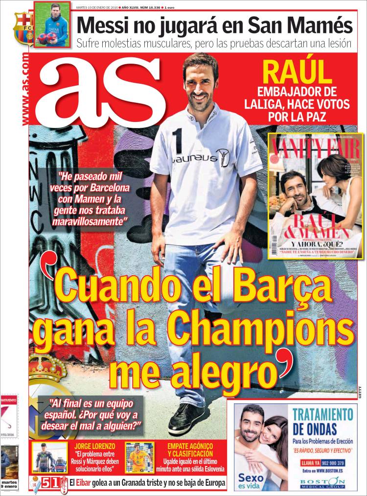 Raúl, por su parte, se asoma a la portada de As (es un decir, porque la ocupa casi por completo) declarando su alegría cada vez que el Barça gana una copa de Europa. Muchos de vosotros estáis agazapados detrás de la siguiente esquina a ver qué decimos sobre esto. Somos conscientes. Que sepáis que lo sabemos.