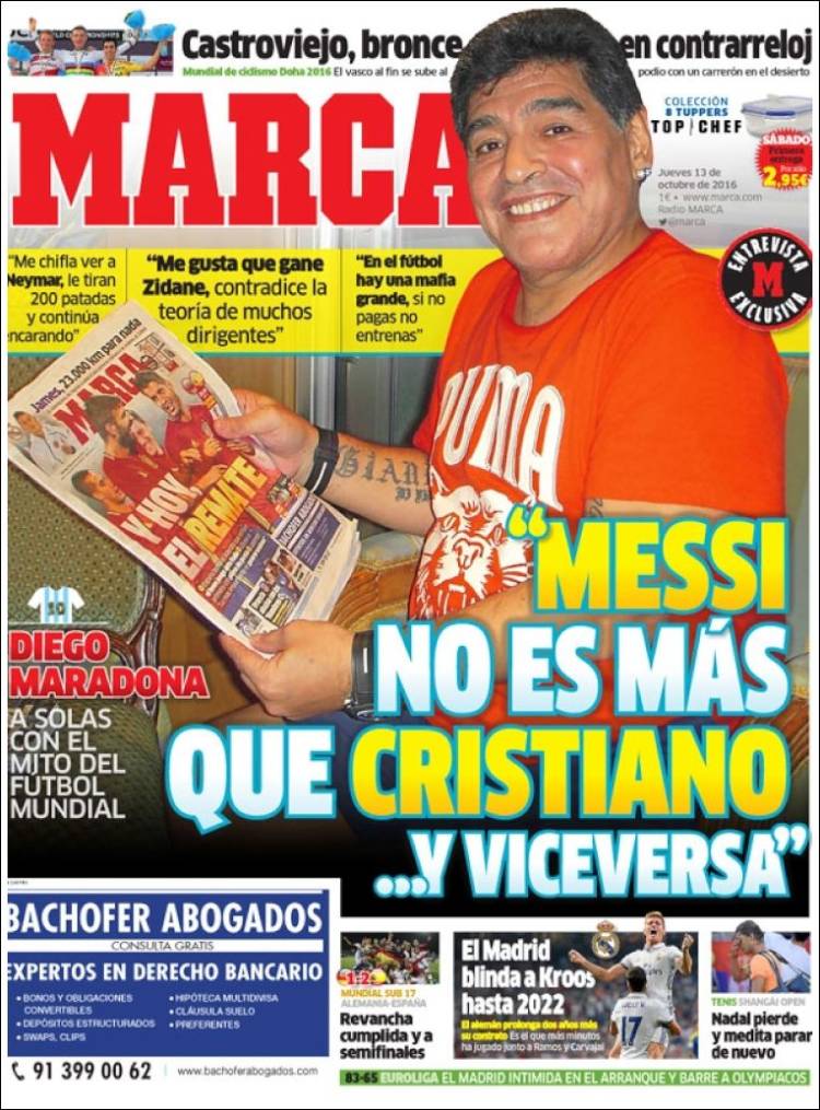 Maradona, por su parte, escandaliza desde la portada de Marca al bienpensismo dogmático culé, reconociendo que Cristiano no tiene nada que envidiarle a Messi (ni viceversa). Que venga ahora mismo Xavi Hernández y le diga al Pelusa las cuatro cosas que se merece, a saber: que es un vikingo desvergonzado, un madridista de pacotilla y un estómago agradecido a la caverna mediática españolista. Fue claro y taxativo Xavi en recientísima entrevista: "Solo si eres del Madrid puedes negar la superioridad de Messi". La consecuencia es clara: Diego es un madridista irredento, muy probablemente mourinhista y franquista.
