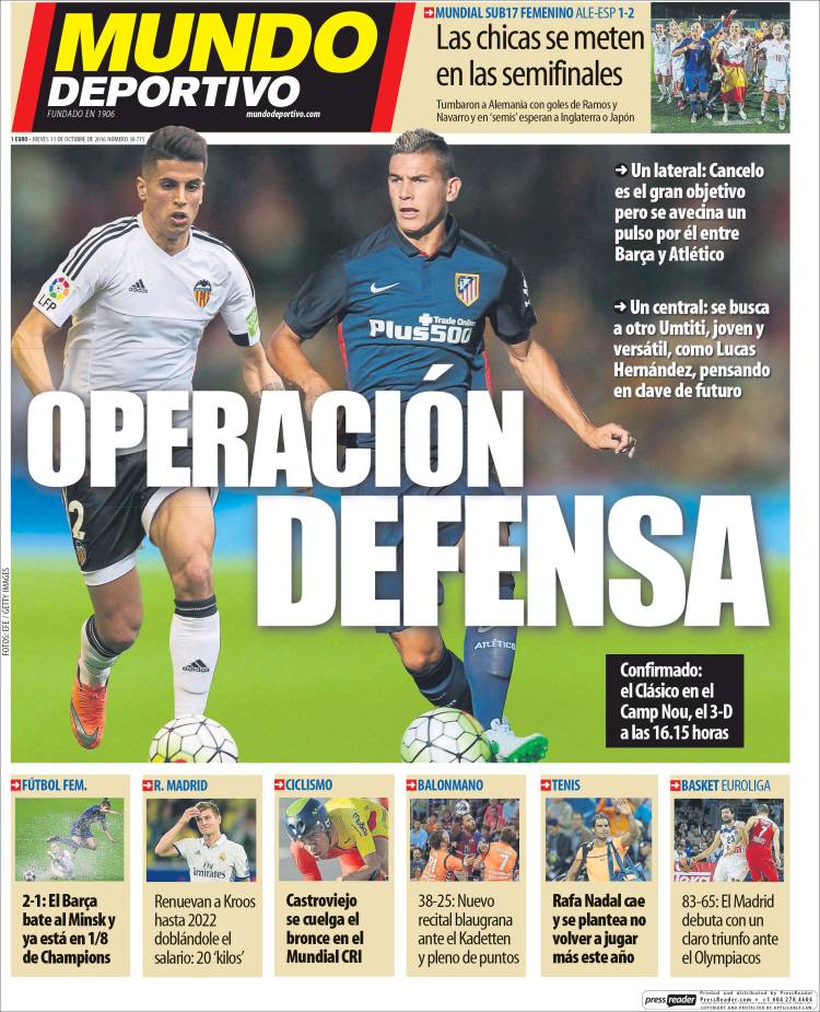 Ahí lo tenéis. Se nos informa en esta primera plana de la renovación del extraordinario centrocampista alemán, a la par que se apuntan los nombres de Cristiano, Bale y Modric como los próximos en pasar por la T4 para firmar. ¿Hemos dicho T4? En realidad, dado que en ningún momento nos dice As a quién debemos atribuir el éxito de renovar a Kroos, no deberíamos asumir que la rúbrica del nuevo contrato vaya a tener lugar en las oficinas del Santiago Bernabéu. Por ninguna parte se nos dice que quien haya alcanzado el éxito de renovar a Kroos (como también el éxito inicial de ficharlo) sea Florentino Pérez, a quien tampoco vemos en esta portada relacionado en modo alguno con las restantes e inminentes renovaciones mencionadas, es decir, las de Cristiano, Bale y Modric. Lo que decíamos: en el Madrid, lo que es huérfano no es la derrota, sino (para nuestra entrañable Ouija) el triunfo o el acierto.