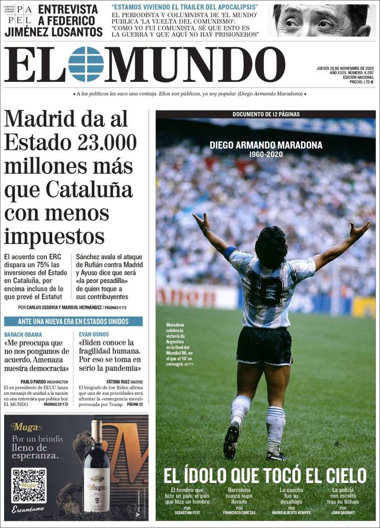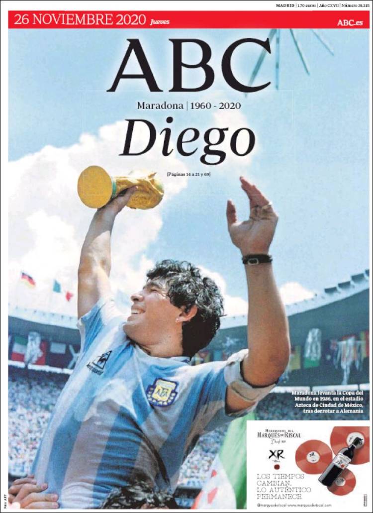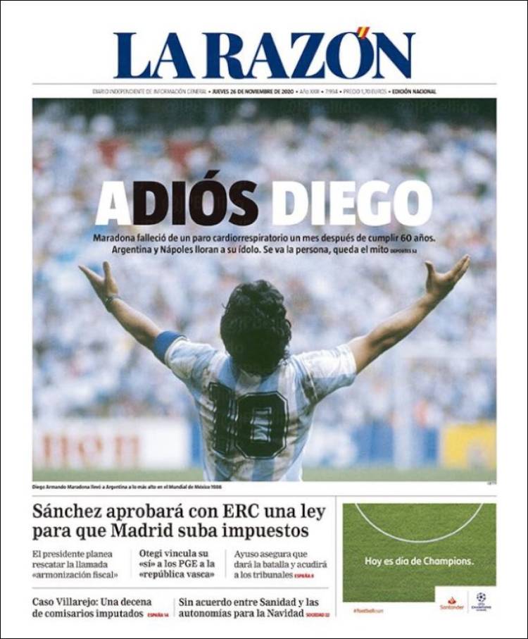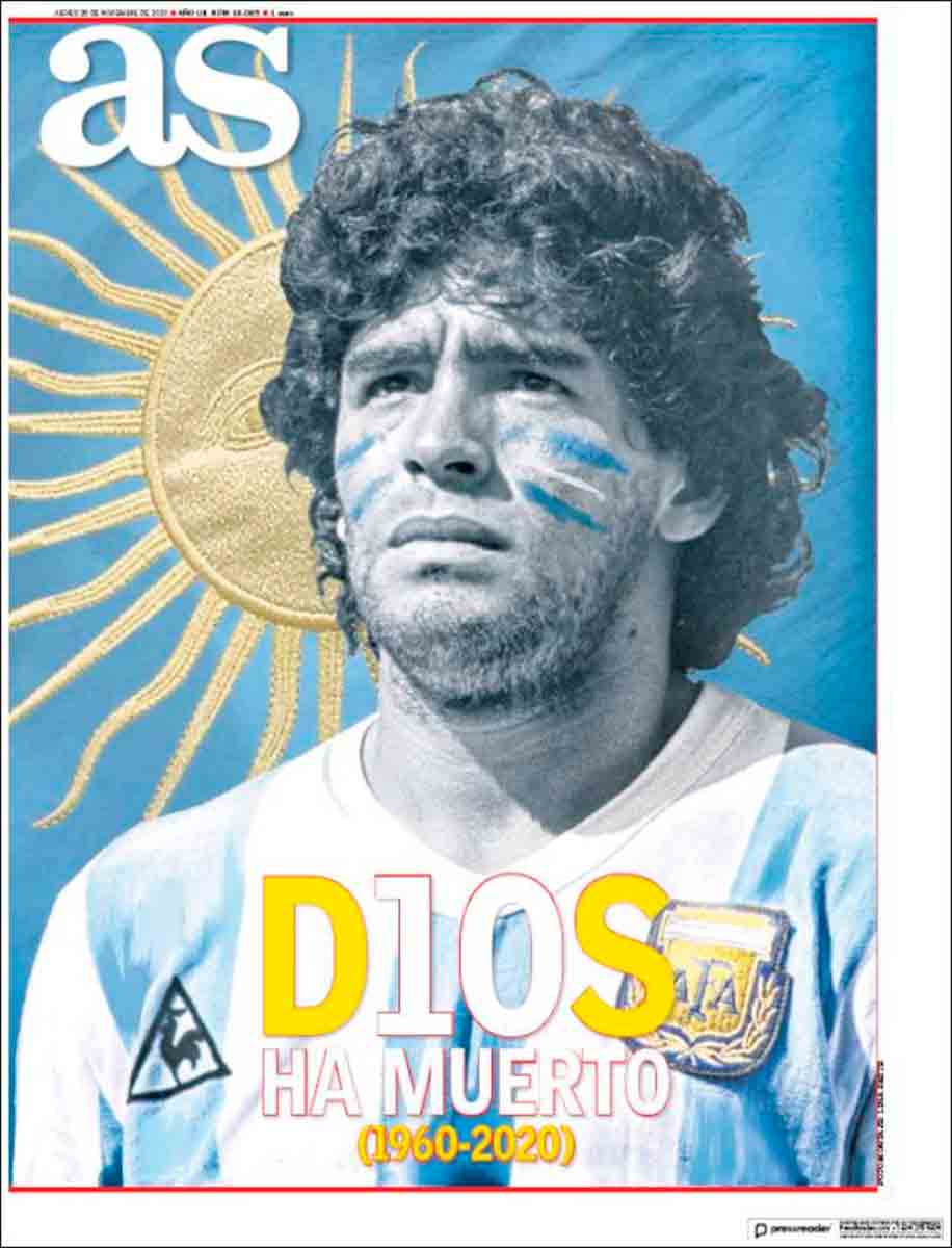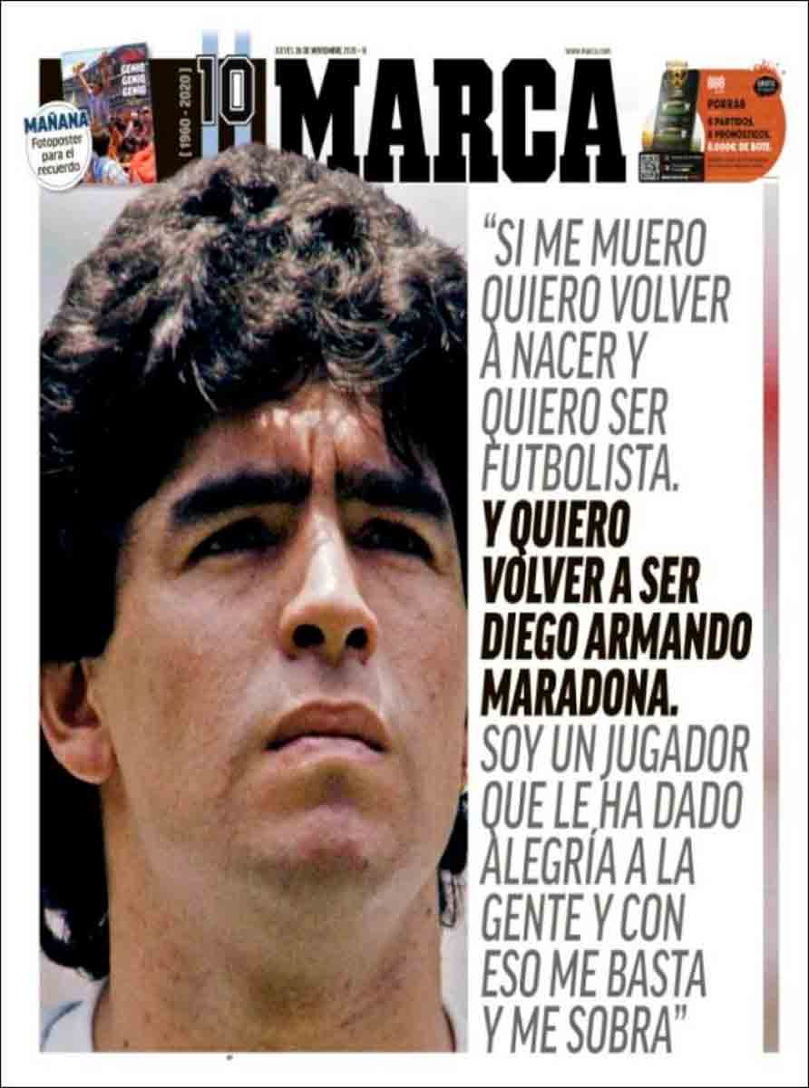 En cuanto a Maradona, viendo las portadas pienso que nos estamos pasando. Grandísimo jugador (quizá el mejor de la historia) que, lejos de ser un dios, era un pobre ser humano sujeto a fuerzas que le sobrepasaron. El futbolista en realidad "muere" el día que se retira de la práctica activa del fútbol. Queda la persona. Y siento más lástima por la persona en que se convirtió que por el hecho de que haya muerto, porque al final todos morimos. Por supuesto, daría mi pésame a su familia y amigos, porque toda pérdida es dolorosa. Incluso a todos esos miles de personas que hoy lloran, especialmente argentinos, porque recuerdan cómo Maradona les hizo felices durante aquel verano del 86.